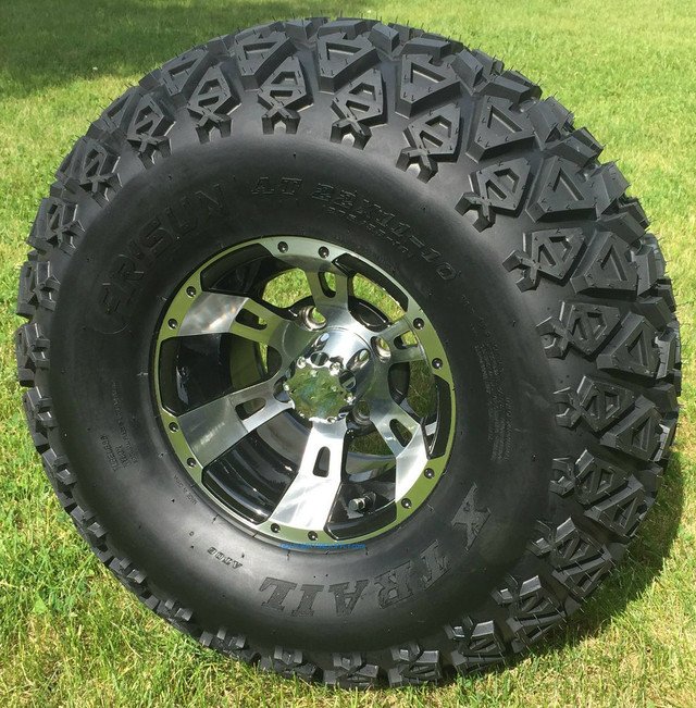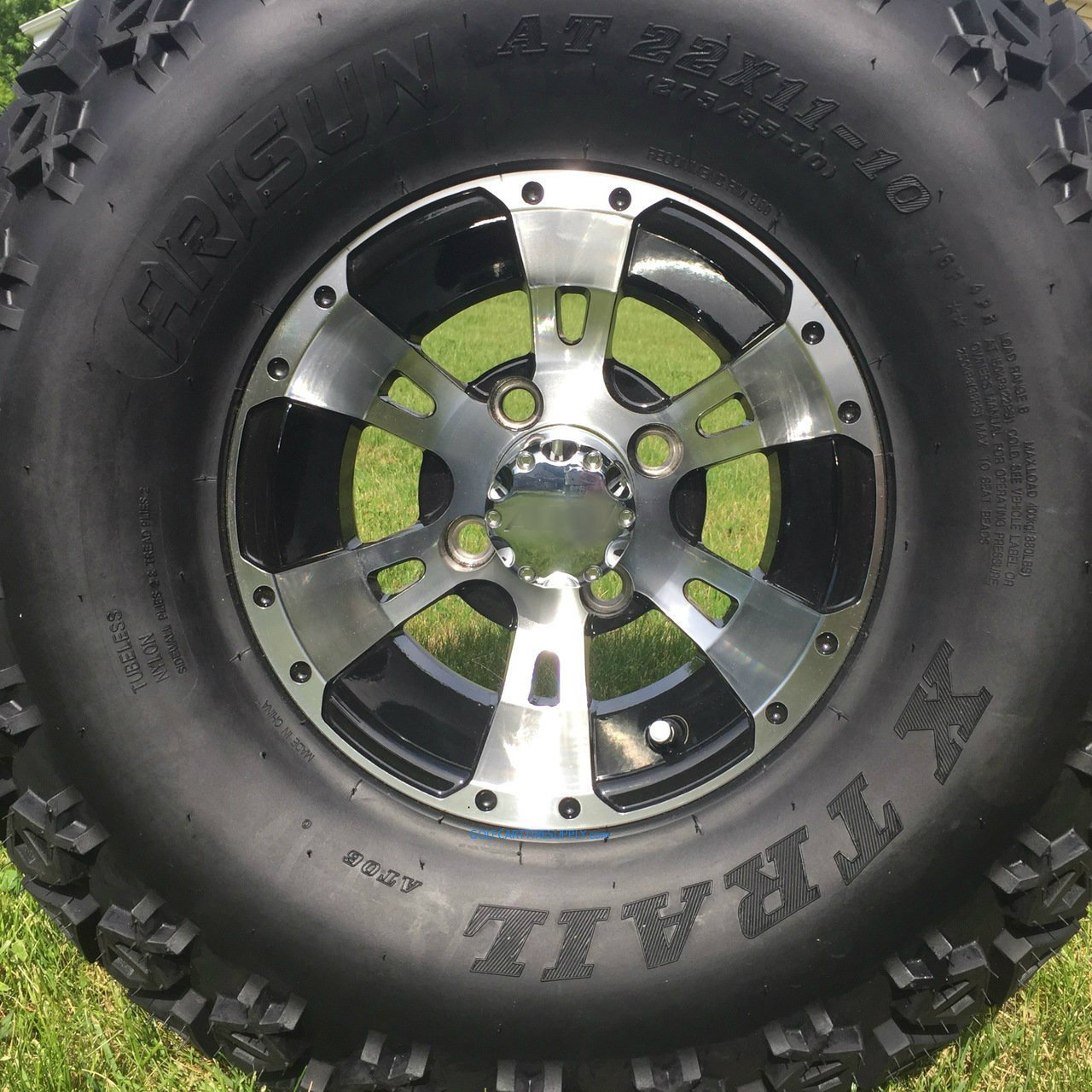 A new classic! The RUCKUS 22×10-10 combo is a rock solid all terrain upgrade for your golf cart. We take brand new 10″ RUCKUS Black/ Machined wheels and mount them up on some 22×10-10″ High Performing DOT (street legal) All Terrain golf cart tires to create a winning combination for all driving conditions.