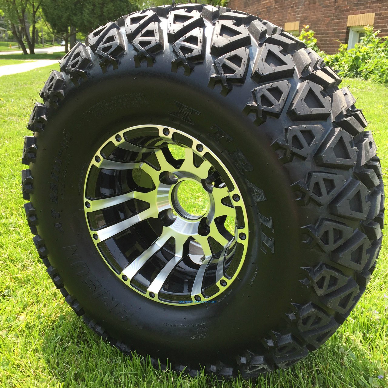 This wheel and tire kit stands in at 23″ from ground to top of tire (diameter)and requires your cart to have 5″ or higher lift kit in order to provide proper wheel clearance. Fits lifted EZ GO, Yamaha, Club Car and more.