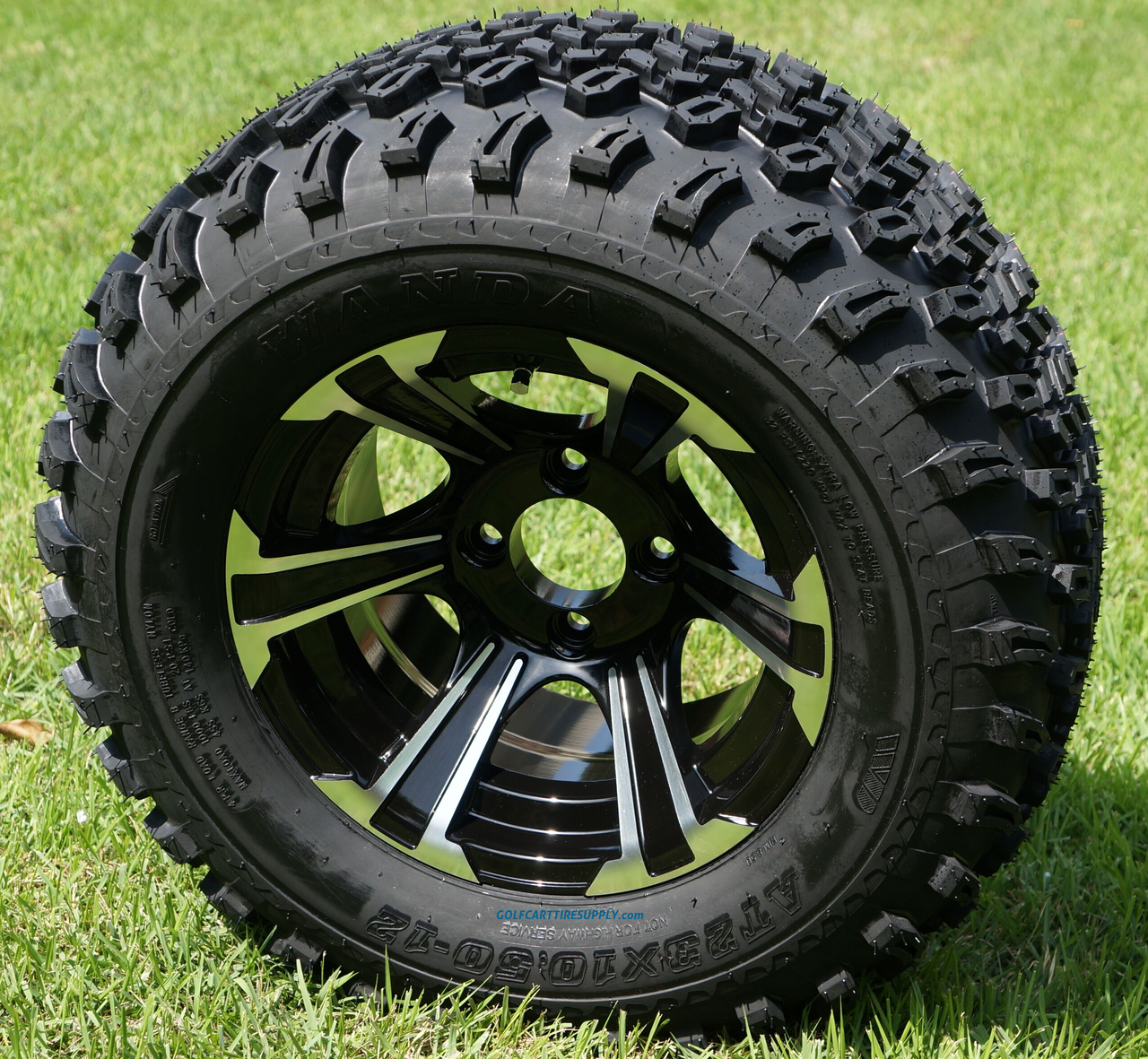 Refined and aggressive, plus, black never goes out of style… This is a seriously tough wheel and tire kit for your lifted golf cart. BLADE aluminum golf cart wheels are built to withstand the test of the elements and are easy to clean. The BLADE wheels are 12″x7″ in Machined/ Black Aluminum and come wrapped up in 23×10.5-12″ All Terrain tires. Each BLADE A-T combo includes: