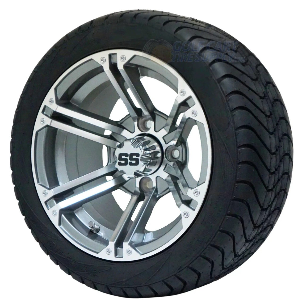 The TERMINATOR GUNMETAL combo is the sleek new wheel and tire combo you have been looking for. 12×7″ GUNMETAL Machined wheels come wrapped up nicely in high-performing 215/40-12 Low Profile tires which are street legal (DOT approved) and Turf Safe. These tires provide a smooth ride on the streets and paths or the fairways, while remaining gentle on grass.