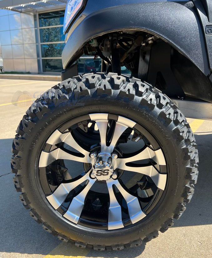 Mean looking AND high-end: The VAMPIRE golf cart wheels and 14″ All Terrain (AT) street legal tires combo is both. These strong and lightweight aluminum golf cart wheels come in a black/ machined finish and look very tough. This combo is only done true justice in person!