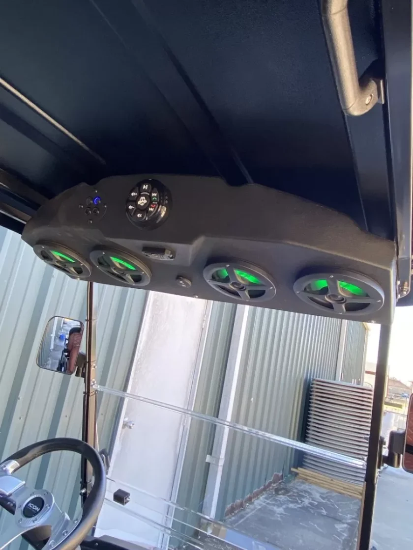-Froghead industries overhead sound system with lights built into speakers and 30” light bar.